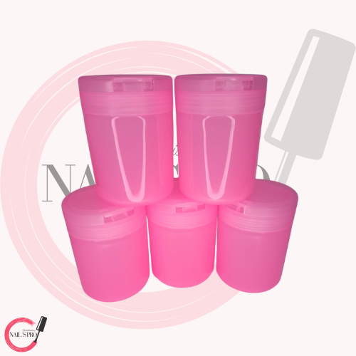 Su color rosado suave aporta un toque femenino y moderno al espacio de trabajo, ideal para salones, estudios o kits personales. Gracias a su apertura superior y base estable, permite una extracción rápida y ordenada, optimizando la rutina de limpieza y preparación de uñas.